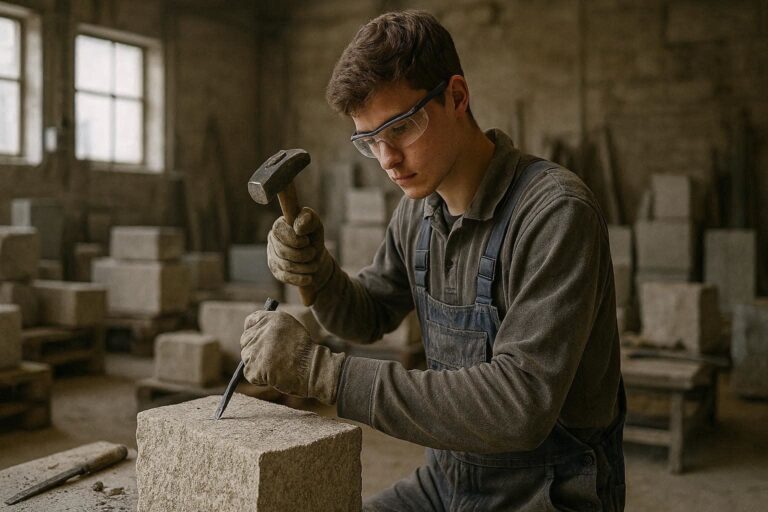 Steinmetz/innen formen und bearbeiten Natursteine zu Kunstwerken, Bauelementen oder Grabmälern. Du arbeitest mit Hammer, Meißel und modernen Maschinen, entwirfst Pläne und setzt sie präzise um. Der Beruf ist kreativ, handwerklich anspruchsvoll und technisch. Du siehst am Ende ein sichtbares Ergebnis deiner Arbeit, das oft viele Jahre Bestand hat. Wer Freude an Gestaltung, Präzision und dem Arbeiten mit Naturmaterialien hat, wird diesen Beruf lieben.